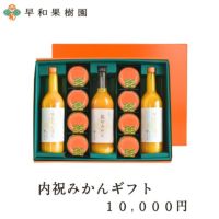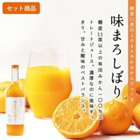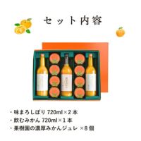 糖度11度以上を誇る有田みかん100%ジュース「味まろしぼり」720ml×2本と「飲むみかん」720ml×1本、果汁91%使用の濃厚有田みかんゼリー「果樹園の濃厚みかんジュレ」8個が入った内祝みかんギフトです。内祝いに高級な無添加ジュースをお探しの方に。