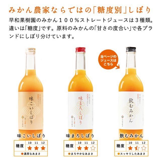 和歌山みかんジュースおすすめランキングで上位に選ばれた人気商品「飲むみかん」を始めとして、糖度の異なる「味まろしぼり」「味こいしぼり」の3種類をご用意。お取り寄せにぴったりのみかんジュース3種類から、お好きなジュースをお選びください。
