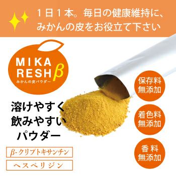 「ミカレッシュβ」は、和歌山県有田産の日本一のブランドみかん「有田みかん」の果皮を乾燥させ粉末状にし、水にとけやすく飲みやすいようにデンプンを加えた食品です。