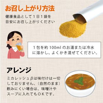 ミカレッシュβは味付けは一切しておりません。(自然のまま)飲みにくい場合は、味噌汁やスープに入れてもOKです。