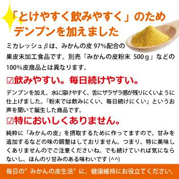 ミカレッシュβは、みかんの皮97%配合の果皮未加工食品です。別売「みかんの皮粉末500g」などの100%皮商品とは異なります。