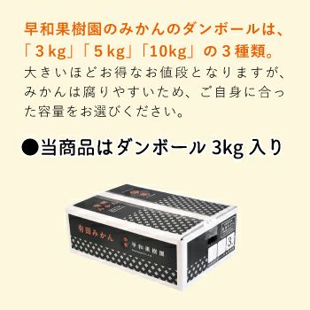 ダンボールセットは3kg入り、5kg入り、10kg入りの3種類をご用意しています。大きいほどお得なお値段となりますが、みかんは腐りやすいため、ご自身に合った容量をお選びください。
