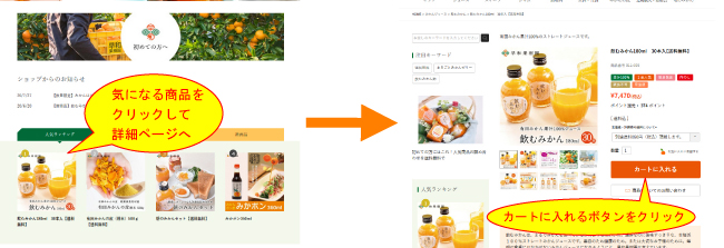 本店ページ内よりお好きな商品をお選びください。画像をクリックしたり、ページの下の方に進んでいけば、商品画像と説明、数量やカゴボタンのある辺りに辿り着きます。お値段を確認し、商品の数を指定して、「カートに入れる」「買い物カゴに入れる」ボタンをクリックしてください。