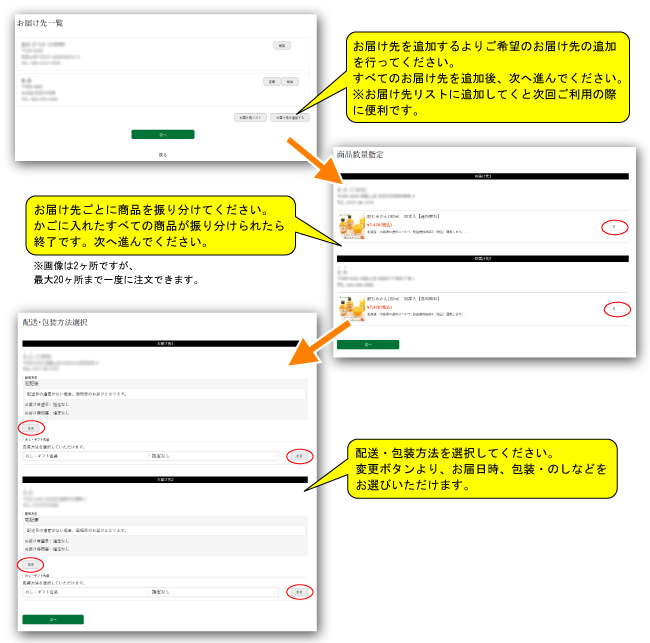 複数へのお届けの場合は、配送先住所と商品のひも付けをする画面が発生します。こちらの画面で、どの商品をどなたにお届けするかを決定します。最大20ヶ所まで一度のご注文で入力可能です。