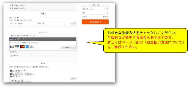 買い物かご内でお好きな決済方法を、6種類から選択してください。