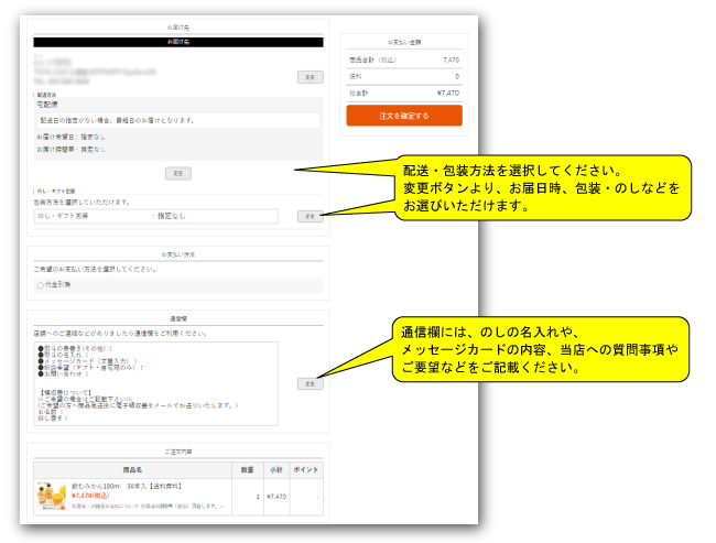 のし・メッセージカード、お届け指定日、通信欄へのご記入はこちらの画面で行ってください。のしの名書きやメッセージカードの内容は通信欄にご記入下さい。