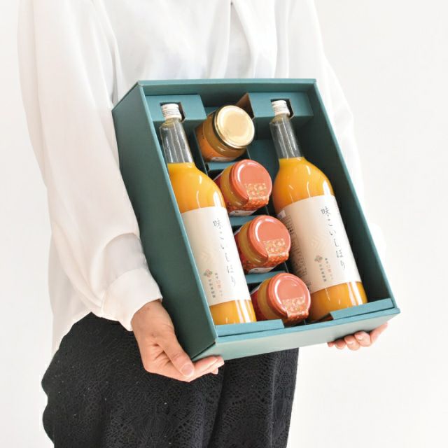 糖度11度以上まろやかな味わいの「味まろしぼり」180ml×4本、91%果汁使用の濃厚有田みかんゼリー「果樹園の濃厚みかんジュレ」120g×2個、人気のまるごとみかん入りゼリー「果樹園の濃厚みかんジュレまるごと入」120g×2個の内祝みかんギフトです。