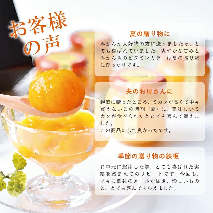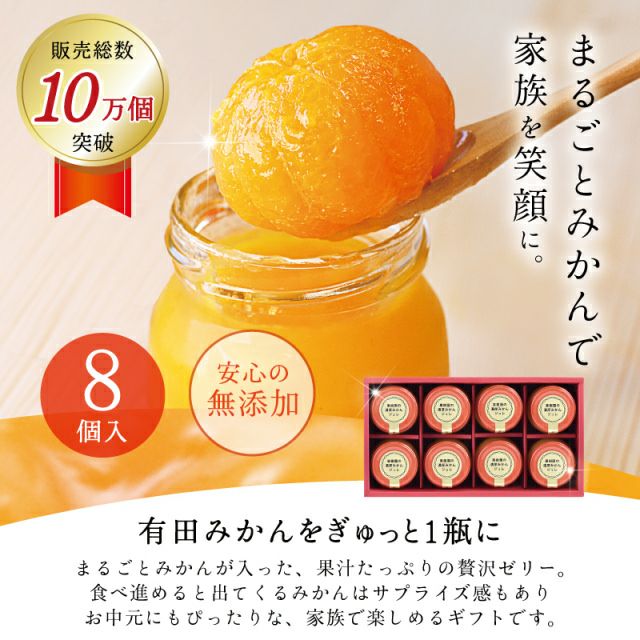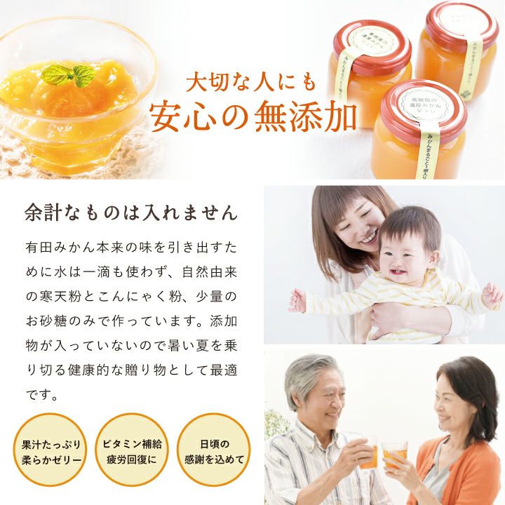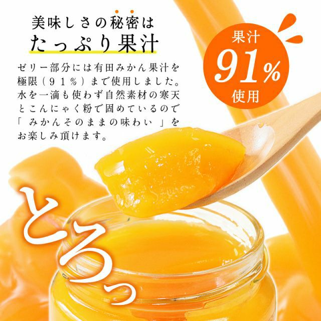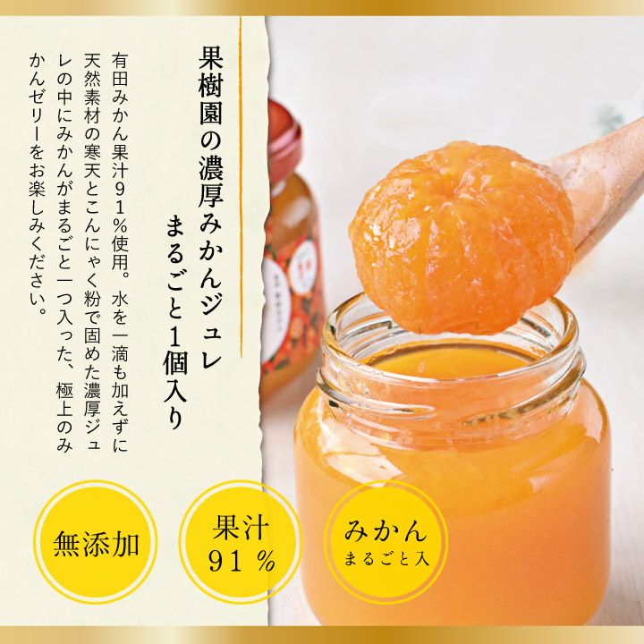 和歌山有田みかん果汁を91%も使用し、濃厚な味わいに仕上げた保存料無添加の高級みかんゼリー。濃厚ジュレは瓶ごとそのまま凍らせてシャーベットとしてもお召し上がりいただけます。