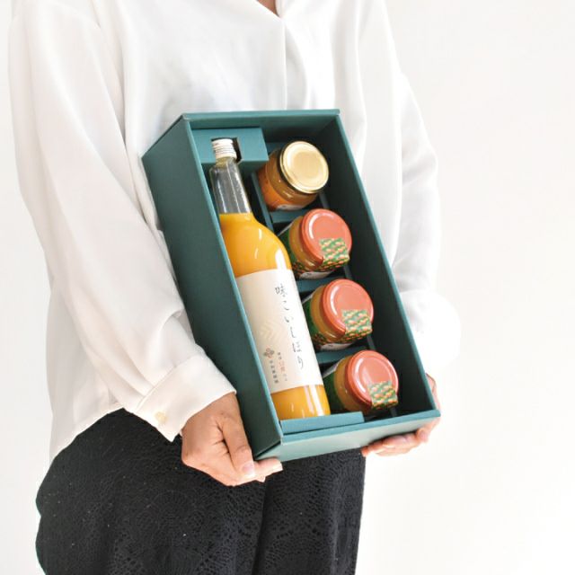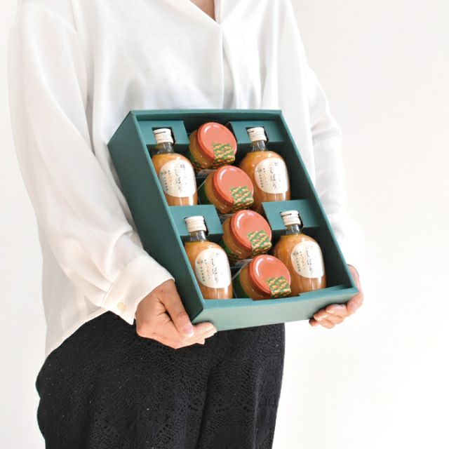 有田みかん100%ジュース「味まろしぼり」720ml×1本と、有田みかん果汁91%使用の濃厚みかんゼリーに小さいみかんが1個入った「果樹園の濃厚みかんジュレまるごと入」120g×3個と、「果樹園のなめらかみかんジャム」130g×1個入りギフト