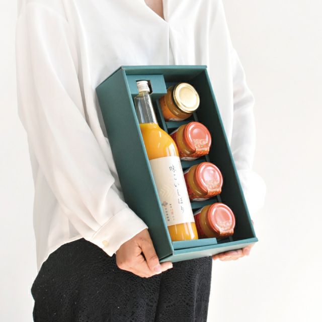 糖度12度以上を誇る有田みかん100%ジュース「味こいしぼり」720ml×1本と、有田みかん果汁91%使用の濃厚みかんゼリー「果樹園の濃厚みかんジュレまるごと入」120g×3個入りと、「果樹園のなめらかみかんジャム」130g×1個入りギフト