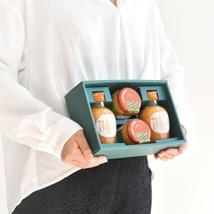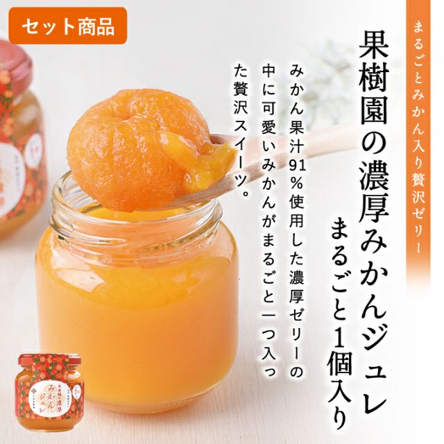 果汁91%使用の濃厚有田みかんゼリー「果樹園の濃厚みかんジュレ」と、「果樹園のなめらかみかんジャム」、有田みかん100%ジュース「味まろしぼり」入りギフト。濃厚なみかんジュースとみかんジュレが楽しめるお贈りものにぴったりのギフトです。