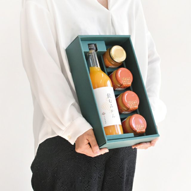 有田みかん100%ジュース「飲むみかん」720ml×1本と、有田みかん果汁91%使用の濃厚みかんゼリーに小さいみかんが1個入った「果樹園の濃厚みかんジュレまるごと入」120g×3個と、「果樹園のなめらかみかんジャム」130g×1個入りギフト