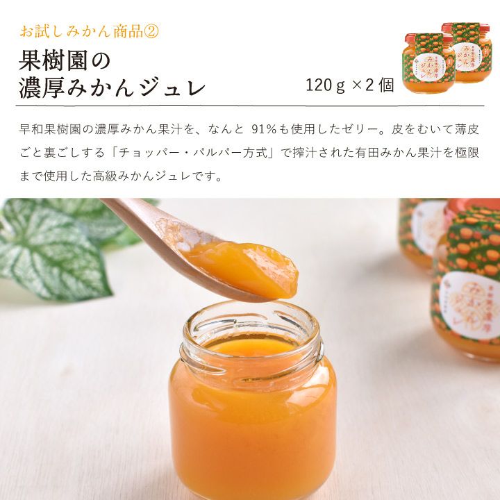果汁91%使用の濃厚有田みかんゼリー「果樹園の濃厚みかんジュレ」と、「果樹園のなめらかみかんジャム」、有田みかん100%ジュース「飲むみかん」入りギフト。有田みかんストレートジュースとみかんジュレが楽しめるお贈りものにぴったりのギフトです。