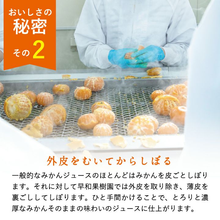 早和果樹園厳選の完熟有田みかんのみを使用。皮をむきフクロごとしぼる「チョッパーパルパー方式」で搾汁。とろりとしたまろやかなのど越しと、甘いのにすっきりとした後味を実現しました。まるでみかんを食べているような深い味わいの「味まろしぼり」2本ギフト。