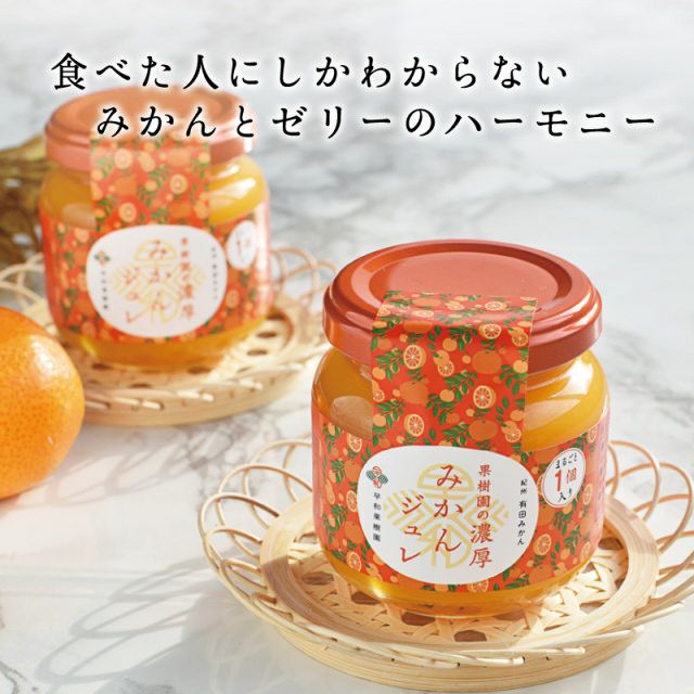 91%果汁使用の濃厚有田みかんゼリー「果樹園の濃厚みかんジュレ」、人気のまるごとみかん入りゼリー「果樹園の濃厚みかんジュレまるごと入」のかわいい小箱のギフト。プレゼントやプチギフトにおすすめ。