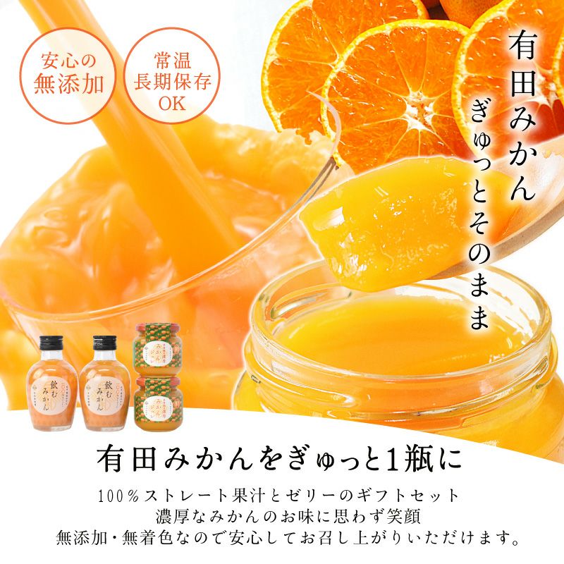 有田みかん100%ストレートジュースの「飲むみかん」180ml×2本と、、91%果汁使用の濃厚みかんゼリー「果樹園の濃厚みかんジュレ」120g×2個入りかわいい小箱ギフト。プレゼントやプチギフトにおすすめ。