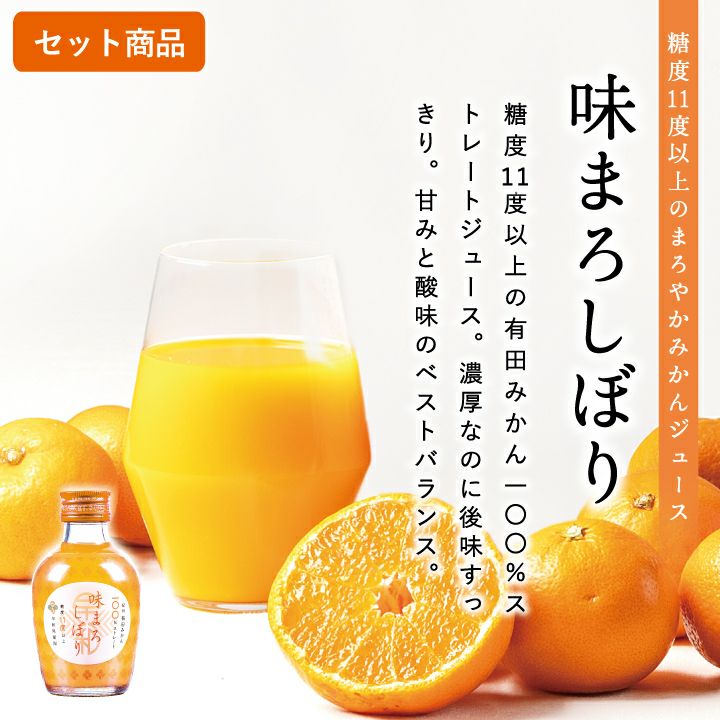 まろやかな糖度11度前後の有田みかん100%ジュース「味まろしぼり」180ml×2本と、91%果汁使用の濃厚みかんゼリー「味一ジュレ」150g×2個入りかわいい小箱のギフト。プレゼントやプチギフトにおすすめ。