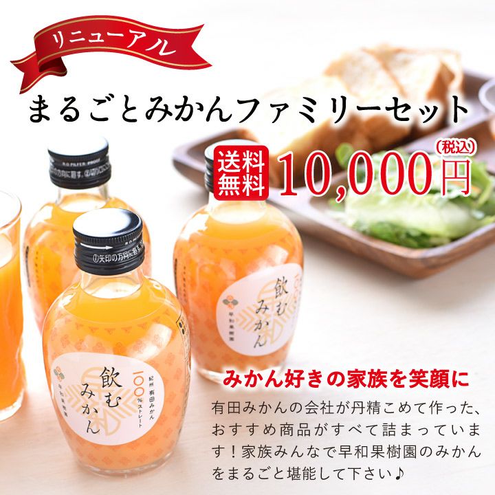 "まるごとみかんファミリーセット【送料無料】有田みかんジュース、ゼリー、ポン酢などの人気商品が詰まった、早和果樹園が誇る最上級のみかんアソートセット。 ギフトに最適のセットです。早和果樹園すべてを”まるごと”お楽しみください!"