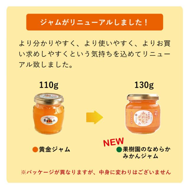 他の画像を見る 果樹園のなめらかみかんジャム130g 保存料無添加 低糖度40度 包装不可 のし不可 常温便 ¥ 490 税込 和歌山県産有田みかん果汁を使用し、なめらかな食感に仕上げたみかんジャム「果樹園のなめらかみかんジャム130g」です。 商品ページへ カートに入れる お気に入りに登録する