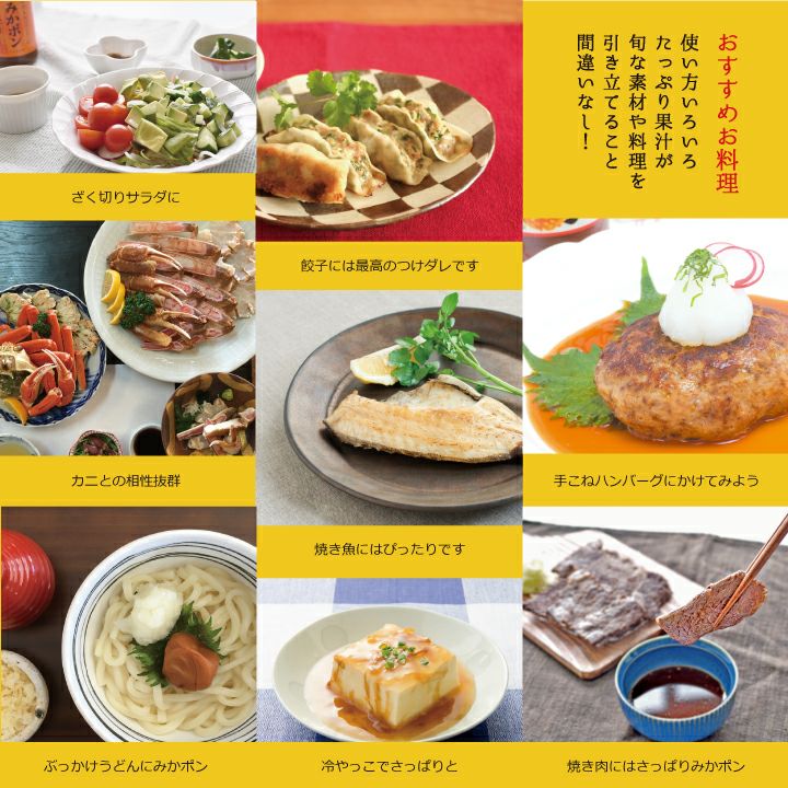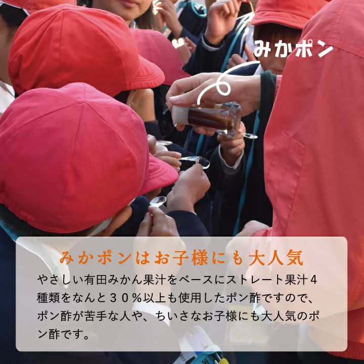 他の画像を見る みかポン200ml(R) 果汁30% 子どもに人気 包装不可 のし不可 常温便 ¥ 590 税込 たっぷり使ったみかん100%果汁をベースに、柚、橙、そしてめずらしい春柑橘「黄金柑」果汁をブレンド。味わって納得「おいしいポン酢」にこだわった、まろやかな酸味のみかんポン酢「みかポン」をどうぞご賞味下さい。 商品ページへ カートに入れる お気に入りに登録する